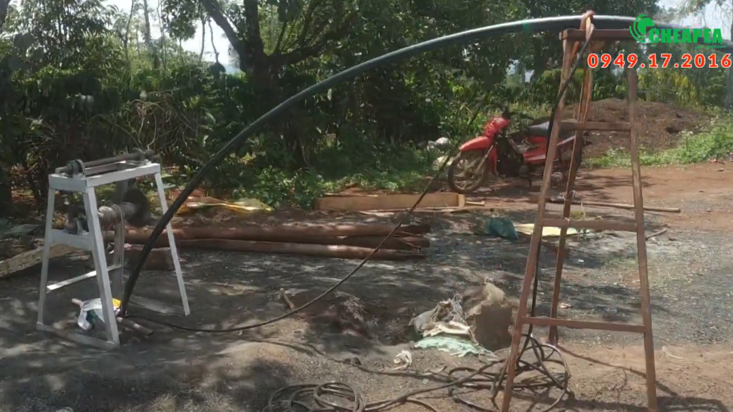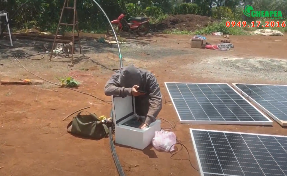 Giếng khoan sâu 120m, đả thả sẵn bơm 5.5HP, CHEAPEA sẽ lắp hệ thống biến tần năng lượng mặt trời để chạy cho bơm hiện có của khách nên không cần phải kéo bơm lên