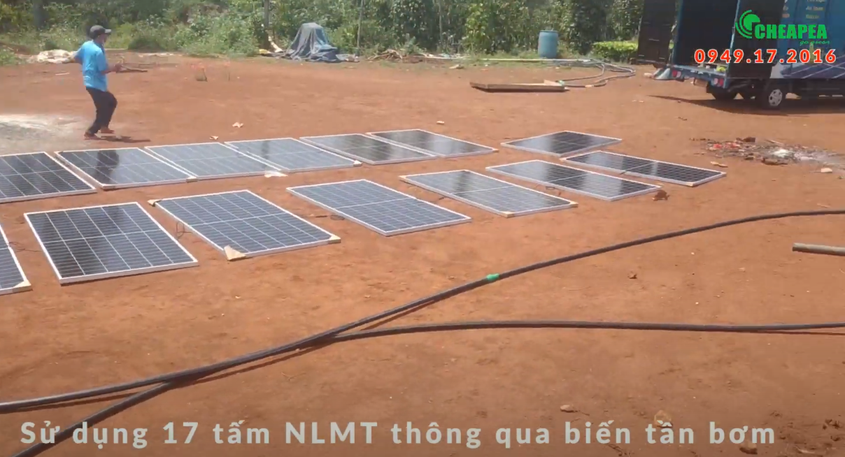 Hệ thống được lắp gồm 17 tấm pin 365W mắc nối tiếp, tổng công suất 6.2KW, đảm bảo để chạy tối da bơm 5.5HP (4KW)
