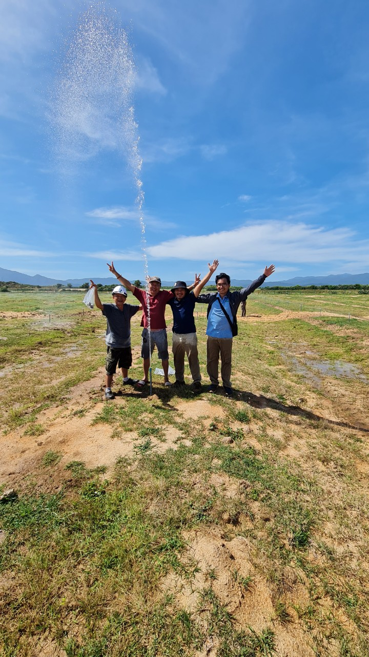 Kết quả không ngoài dự tính, béc phun đều và đẹp, áp lực nước lớn khiến cho toàn bộ khu vực bao quanh bởi sương mù, đất Ninh Thuận rất khô cằn nhưng chỉ sau vài phút tưới là bắt đầu ẩm đều, đảm bảo cho sự phát triển của cây bưởi khi xuống giống