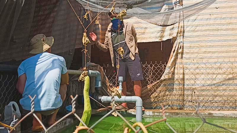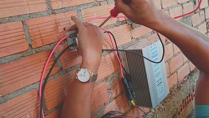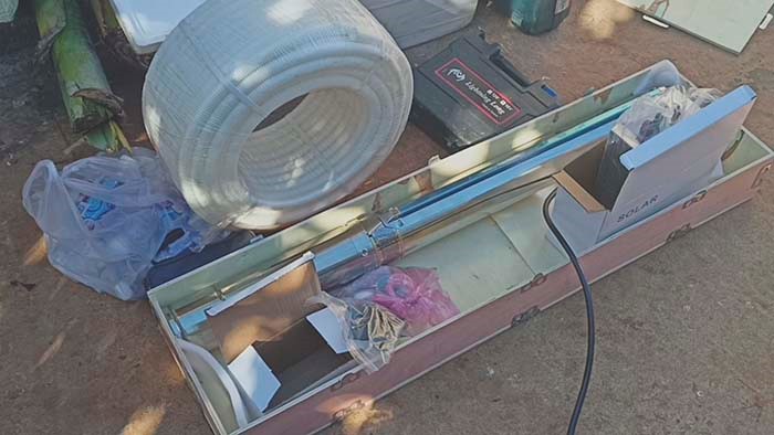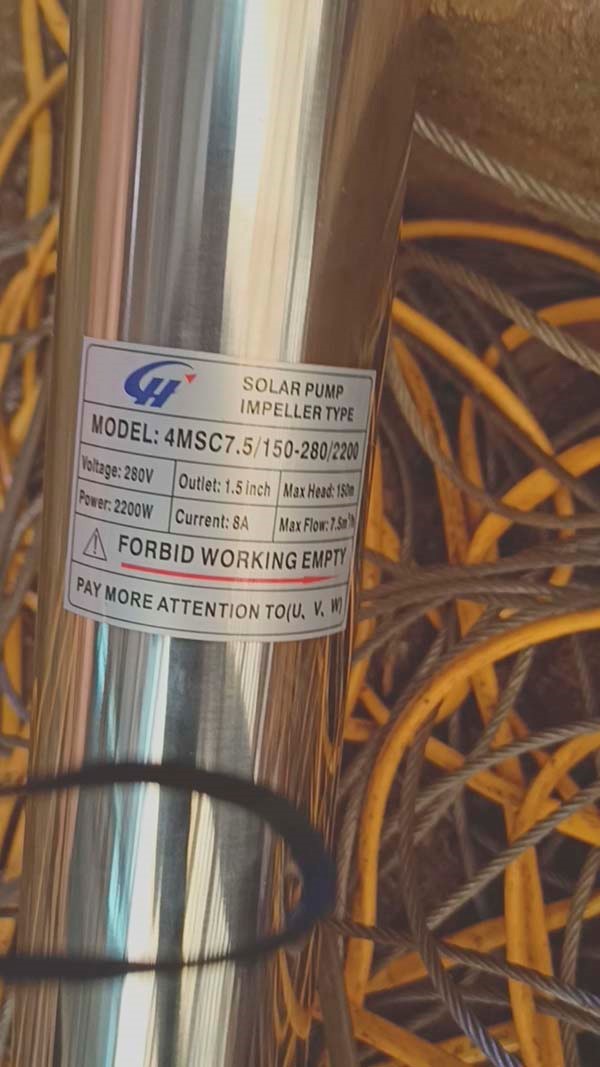 Lắp đặt tại vườn bơm 3HP năng lượng mặt trời bơm đẩy từ giếng sâu 110m lên tích bể sau đó sẽ dùng bơm NLMT 2HP để đẩy đi tưới tay tại vườn.