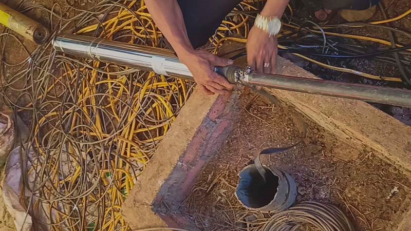 Bơm được nối ống và chuẩn bị thả giếng 110 mét