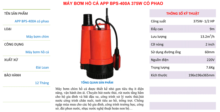 Thông số kỹ thuật của máy bơm chìm hồ cá APP BPS-400A 375W Có phao: