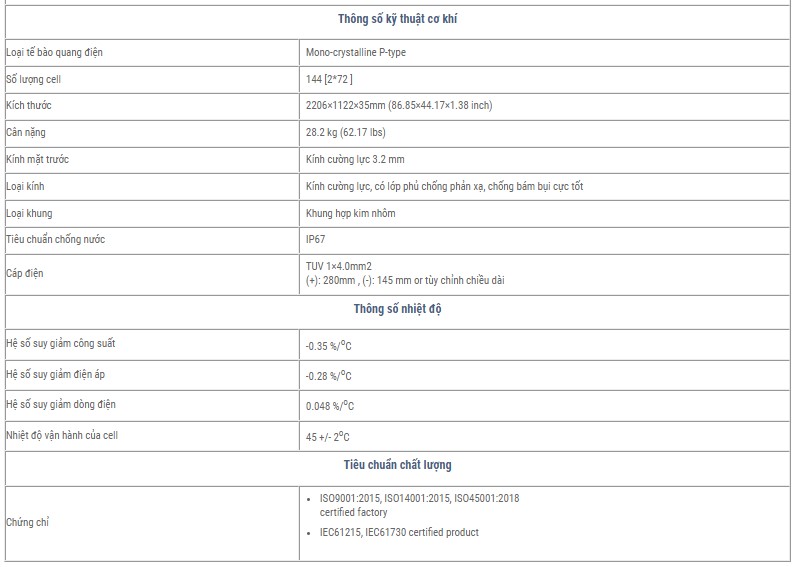 Thông số kỹ thuật của tấm pin JINKO Tiger Pro 525W: