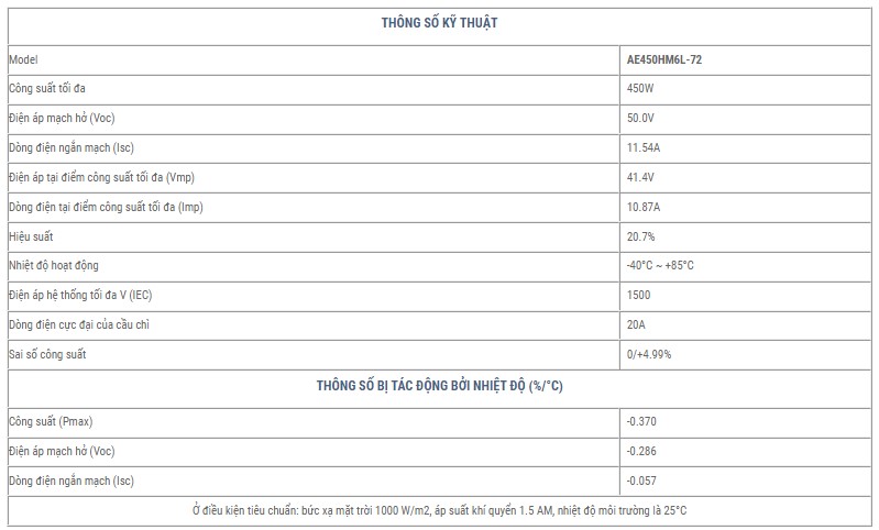 Đặc điểm của tấm pin năng lượng mặt trời AE Solar 450 Wp: