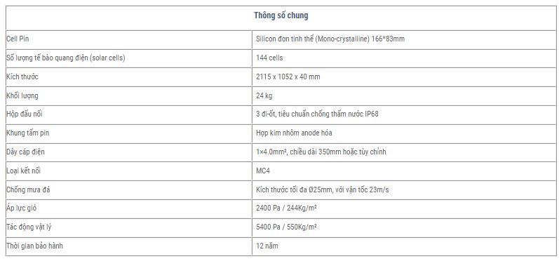 - Năng suất cao hơn từ 0 đến 5 Wp đảm bảo hoạt động hệ thống hoạt động hiệu quả và ổn định. Khung nhôm 350mm có khả năng chịu tải trọng lên đến 5400Pa. Hộp nối dây (3 diot bypass) được bảo vệ IP68, vận hành trong mọi điều kiện thời tiết.