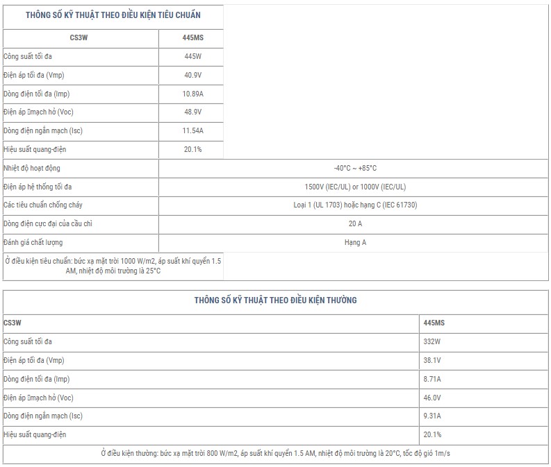 - Pin Canadian 445W hiện nay đang có chỉ số PTC cao nhất thế giới đạt được 93,13% và hiệu suất chuyển đổi quang điện hầu như không bị suy giảm trong điều kiện thời tiết thất thường kể cả khi nắng yếu.