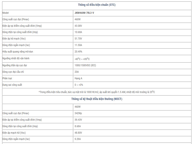 Thông số kỹ thuật của Pin NLMT Jinko 460W: