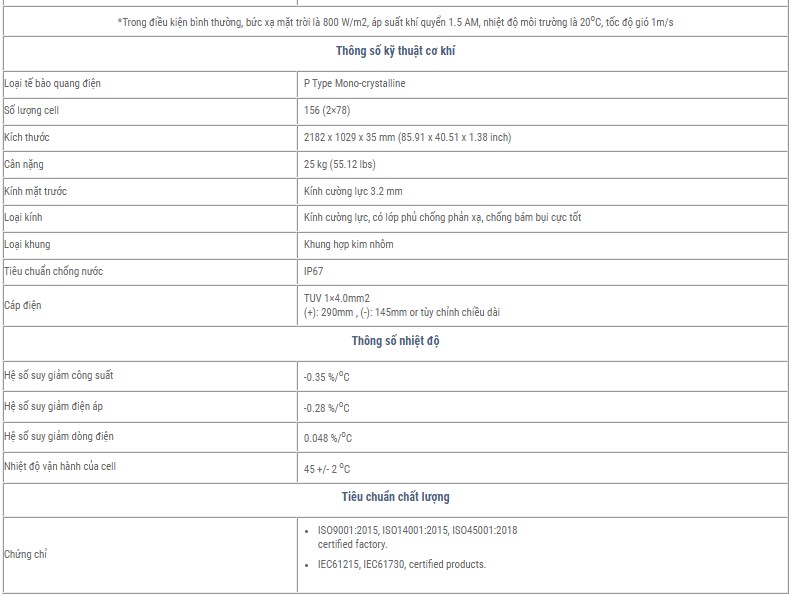 - Sản phẩm đạt được nhiều chứng chỉ tiêu chuẩn, chất lượng như: ISO9001:2015, ISO14001:2015, ISO45001:2018, IEC61215, IEC61730.