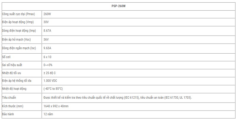 + Với độ bền cao và tuổi thọ kéo dài tới 25 năm cùng chất lượng đạt tiêu chuẩn an toàn quốc tế nên tấm pin Poly PSP-260W có chi phí bảo trì khá thấp.