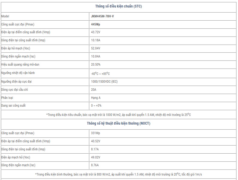 Thông số chi tiết của pin mặt trời Jinko solar Cheetah Plus 445W: