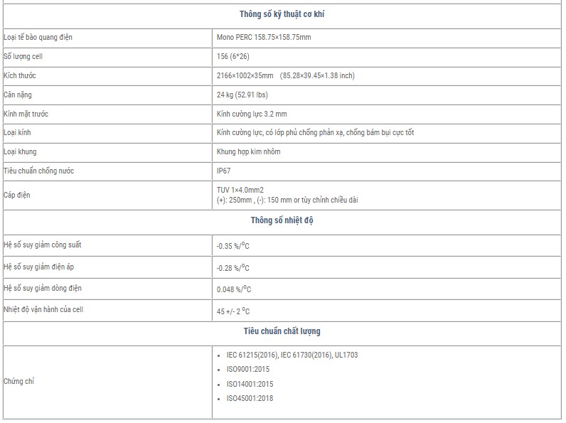 - Sử dụng công nghệ PERC tích hợp trên 6 dãy tế bào cho số lượng tế bào lên đến 156 cell hoạt động mạnh mẽ trên tấm pin.