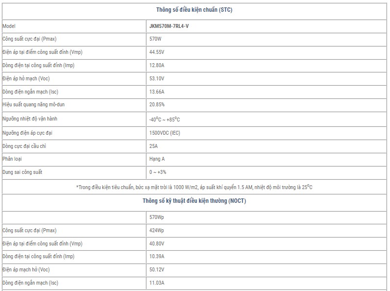Thông số kỹ thuật của pin năng lượng mặt trời Jinko solar 570W: