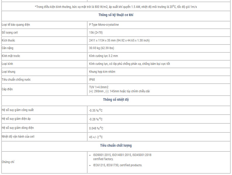 + Sản phẩm đạt được nhiều chứng chỉ tiêu chuẩn, chất lượng như: ISO9001:2015, ISO14001:2015, ISO45001:2018, IEC61215, IEC61730