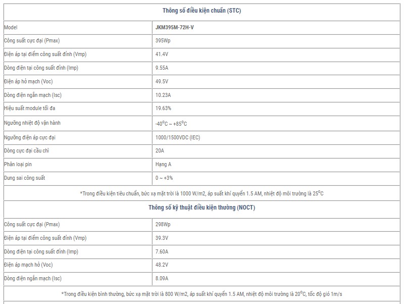 - Công suất cực đại 395W và hiệu suất tấm pin hiệu quả 19.63%
