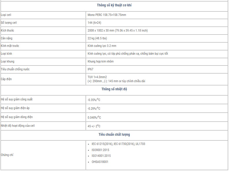 - Các chứng chỉ chất lượng an toàn quốc tế ISO9001, ISO14001, OHSAS18001 và các tiêu chuẩn như IEC 61215, IEC61730, UL1703 mang đến sự an tâm cho khách hàng khi lựa chọn tấm pin.