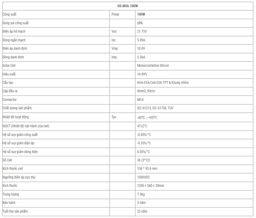 + Chất lượng đạt tiêu chuẩn quốc tế IEC 61215, IEC 61730, TUV, được bảo hành 5 năm, tuổi thọ sản phẩm đạt 25 năm với hiệu suất vẫn trên 80%, có nhiệt độ hoạt động từ 40 đến 85 độ C.