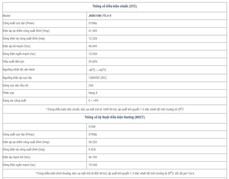 Thông số kỹ thuật của tấm pin JINKO Tiger Pro 510W: