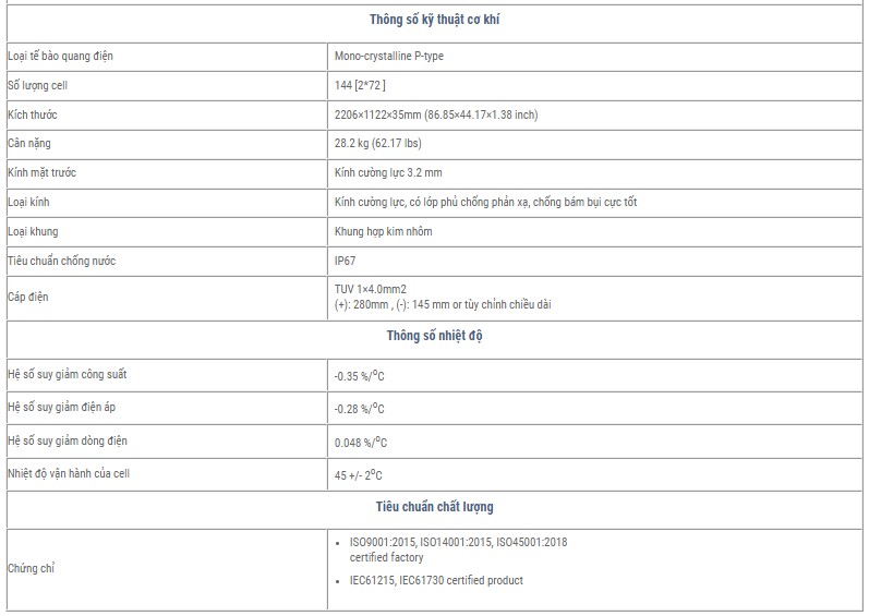 Năm đầu tiên hiệu suất tấm pin suy giảm 2%, các năm tiếp theo hiệu suất suy giảm 0.55%, vẫn đảm bảo hiệu suất cao trong vòng đời của pin.