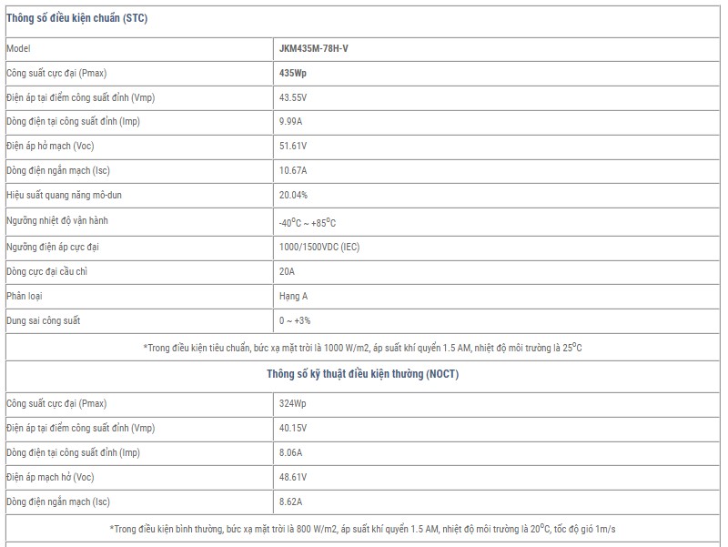 Thông số chi tiết của pin mặt trời Jinko 435W: