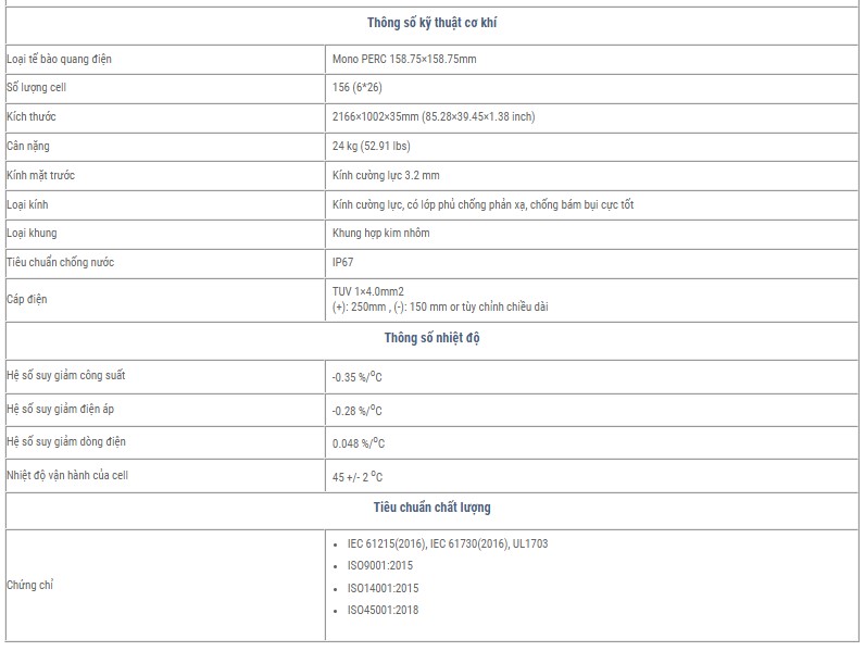 - Hệ số chống PID cao hạn chế việc suy giảm dòng điện trong sản xuất hoàn loạt và hệ số giảm dòng điện theo nhiệt độ chỉ 0.048% trên mỗi độ C giúp tấm pin hoạt động ổn định hơn.